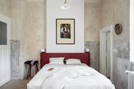 Hrubé omítky, kameninový džbánek, červená stolička, soumrak za oknem. Tenhle byt má atmosféru starých časů a teď je možné si ji užívat celou noc.