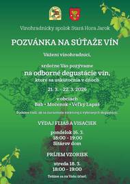 Vinohradnícky spolok Stará hora Jarok pozýva vinohradníkov na odborné degustácie vín v dňoch 21.3. - 22.3.2026 do obcí Báb, Močenok a Veľký Lapáš. Viac informácií na plagáte.