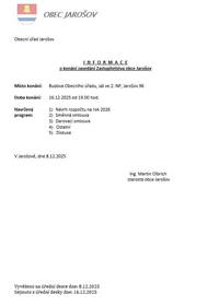 Místo konání: Budova Obecního úřadu, sál ve 2. NP, Jarošov 96 Doba konání: 16.12.2025 od 19.00 hod. Navržený program: 1. Návrh rozpočtu na rok 2026 2. Směnná smlouva 3. Darovací smlouva 4. Ostatní 5. Diskuse