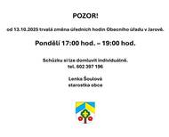 Od 13.12.2025 trvalá změna úředních hodin Obecního úřadu v Jarově PONDĚLÍ 17:00 hod. - 19:00 hod.