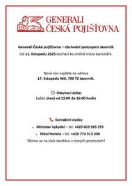 Generali Česká pojišťovna – obchodní zastoupení Javorník Od 11. listopadu 2025 dochází ke změně místa kanceláře. Nově nás najdete na adrese: 17. listopadu 460, 790 70 Javorník.