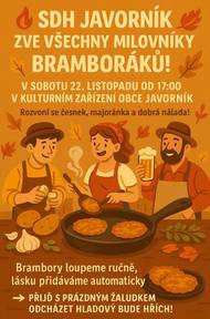 SDH Javorník zve všechny milovníky bramboráků. Sobota 22.listopadu od 17:00 v kulturním zařízení obce Javorník