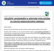 Jenisovice: Pripominame, ze znamky pro svoz odpadu na rok 2026 budou vydavany dnes do 17h. a zitra od 8h.do 11h. a od 13h. do 17h. Pytle muzete vyzvedavat v prubehu roku v urednich hodinach.Blizsi informace byly opakovane zverejnovany na webu obce, Munipolis a na nastenkach. Dekujeme