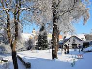 Obecní park u hasičská zbrojnice se v zimním období proměňuje v kouzelné místo. Sníh pokrývá stromy a budovy, což vytváří malebnou adventní a vánoční atmosféru.