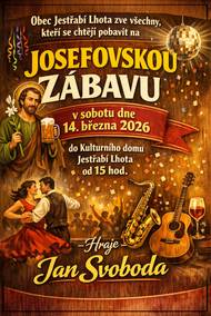 Přijďte na Josefovskou zábavu, která se koná v sobotu 14. března 2026 od 15:00 v Kulturním domě Jestřabí Lhota. Těšit se můžete na hudební vystoupení Jana Svobody a skvělou zábavu.