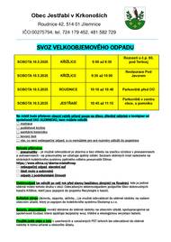 Jestrabi v Krkonosich: Svoz velkoobjemoveho odpadu: KRIZLICE: sobota 15. 4. 9:00 - 10:00 rozcesti u Trlice u c.p. 80: 10:00 - 11:00 Pod Javorem. JESTRABI: sobota 22. 4. 9:00 -10:00 parkoviste. ROUDNICE: sobota 22.4. 10:00 - 11:00 parkoviste OU. Nebude prijiman stavebni odpad, eternit, pneumatiky. Neodkladejte nikde odpad predem, dekujeme!