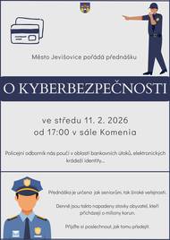 Město Jevišovice a Policie ČR pořádá přednášku o bezpečnosti v kyberprostoru. Každý den čelíme útokům šmejdů, kteří se nás či naše blízké snaží připravit o peníze, nemovitý majetek či jinak útočí na naši integritu. Na přednášce vystoupí odborníci z řad Policie ČR, popíší praktiky šmejdů a také probereme rady jak jím čelit. Přednáška se uskuteční 11. února 2026 od 17:00. Vstup je zdarma Přednáška není jen pro seniory, ale pro všechny - každý z nás může být napaden!