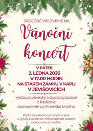 V pátek 2. ledna se na Starém zámku v Jevišovicích v kapli sv. Ludvíka uskuteční koncert pěveckého a dudáckého souboru z Radkovic u Hrotovic pod vedením pana F. Malého. Zazní vánoční písně a úryvky vánočních mší. Všichni jsou srdečné zváni :-)