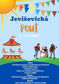 Město Jevišovice srdečně všechny zve na JEVIŠOVICKOU POUŤ, která se uskuteční 1.-3.5.2026. 1.5. Nás od 11 hodin čekají kolotoče a pochutiny pro děti, ve večerních hodinách zábava se skupinou Cauliflower - vstupné 100Kč + předtančení místní chasy v krojích (před začátkem zábavy). 2.5. budou opět celodenní kolotoče, dobroty pro děti. A v neděli 3.5. od 8:00 v kostele sv. Josefa mše svatá. TĚŠÍME SE NA VÁS!