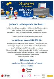 Vám všem, kteří jste se do letošní sbírky zapojili, patří poděkování. Všem organizátorům, koledníkům a také dárcům z naší obce.