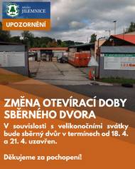 Upozorňujeme, že v souvislosti s velikonočními svátky bude sběrný dvůr v termínech od 18. do 21. dubna uzavřen. Děkujeme za pochopení!