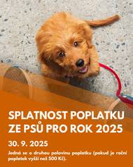 Připomínáme držitelům psů, že do 30. září 2025 je splatnost poplatku ze psů za druhé pololetí roku 2025.