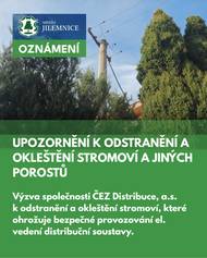 Společnost ČEZ Distribuce, a. s. upozorňuje vlastníky a uživatele pozemků, přes které vede elektrické vedení, na povinnost provést odstranění nebo ořez stromoví a porostů ohrožujících bezpečné a spolehlivé provozování elektrické distribuční sítě.