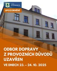 Ve dnech 23. - 24. října 2025 bude Odbor dopravy Městského úřadu Jilemnice uzavřen z provozních důvodů. Děkujeme za pochopení!