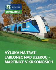 České dráhy informují, že v úseku Jablonec nad Jizerou - Martinice v Krkonoších proběhne výluka železniční dopravy. Termín od 3. do 7. listopadu 2025, vždy v době 8:40 - 17:20 hodin.