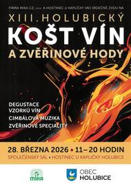 Firma MIKA a Obec Holubice vás zvou na XIII. Holubický košt vín a zvěřinové hody, který se koná v sobotu 28. března od 11 hodin v sále hostince U Kapličky. Vložné je 500 Kč, v ceně je sklenice, katalog a neomezená degustace vzorků vína. Těšit se můžete na cimbálovou muziku.