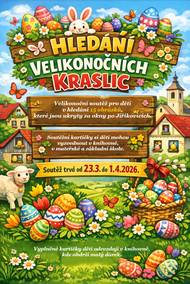 Velikonoční soutěž pro děti v hledání 15 obrázků s velikonočními kraslicemi. Obrázky budou umístěny za okny po Jiříkovicích. Soutěž trvá od 23.3. do 1.4.2026. Soutěžní kartičky si děti vyzvednou v ZŠ, MŠ nebo obecní knihovně.