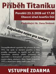 Vážení spoluobčané, zveme vás na nadcházející akce, které se uskuteční v naší obci v následujících dnech. Přijďte se zapojit, pobavit nebo podělit o své názory: 🛠 Sobota 21. 3. od 9:00 Brigáda na hřišti Pomozte nám zvelebit obecní hřiště. Každá ruka se hodí! 💃 Neděle 22. 3. od 11:00 Taneční zábava pro seniory Hudba pana Hašlara 📍 sál OÚ Příjemné posezení a tanec v přátelské atmosféře. 🚢 Pondělí 23. 3. od 17:00 Příběh Titaniku – přednáška 📍 sál OÚ ☕ Občerstvení zajištěno 🎟 Vstup zdarma 🗣 Středa 25. 3. od 17:00 Diskuse k rozvoji obce v letech 2026–2032 📍 kancelář starosty Přijďte sdílet své nápady a podněty. 🌱 Sobota 28. 3. od 9:00 Ukliďme Josefův Důl Úklid parku a společné opékání. Spojme síly pro čistší obec! ℹ️ Více informací: 👉 www.obec-josefuvdul.cz Těšíme se na vaši účast! Vaše obec Josefův Důl