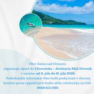 Obec Kalná nad Hronom organizuje zájazd do Chorvátska – destinácia Mali Drvenik v termíne od 11. 7 do 18. 7. 2026. Podrobnejšie informácie Vám budú poskytnuté v obecnej knižnici počas výpožičných hodín alebo telefonicky na čísle 0940 655 030.