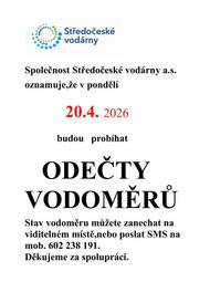 Dne 20.4.2026 budou v obci probíhat odečty vodoměrů. Stav vodoměru lze také zaslat na tel.: 602 238 191