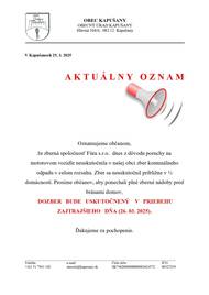 V Kapušanoch 24. 03. 2025 Oznamujeme občanom, že v súvislosti s výskytom ochorenia zvierat slintačky a krívačky na území SR bol na internetovej stránke obce www.kapusany.sk v sekcii život v obci/aktuality zverejnený dokument Mimoriadne núdzové opatrenia hlavného veterinárneho lekára SR č. z. MNO-2550/2025, č.s. 6534/2025-220 s platnosťou a účinnosťou od 21. 3. 2025 do odvolania. Celý dokument je zverejnený aj na úradnej tabuli obce.