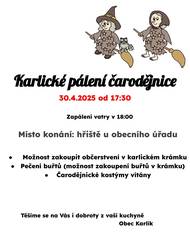 Zveme vás na pálení čarodějnic! 🧙♀️🔥 📅 Kdy: 30. dubna 📍 Sraz: v 17:30 na hřišti u obecního úřadu Karlík 🔥 Pálení: v 18:00 Buřty na opékání budou k zakoupení v krámku přímo na místě. Přijďte si užít společný večer u ohně, dobrou náladu a tradiční zvyky. Těšíme se na vás! Obec Karlík
