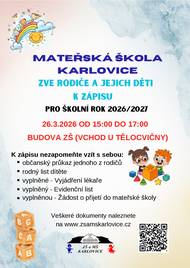 Mateřská škola Karlovice srdečně zve rodiče a jejich děti k zápisu do mateřské školy pro školní rok 2026/2027. 📅 Termín zápisu: 26. března 2026 ⏰ Čas: od 15:00 do 17:00 hod. 📍 Místo: budova ZŠ Karlovice (vchod u tělocvičny) K zápisu si prosím přineste: občanský průkaz jednoho z rodičů rodný list dítěte vyplněné vyjádření lékaře vyplněný evidenční list vyplněnou žádost o přijetí do mateřské školy Veškeré potřebné dokumenty naleznete na webových stránkách školy: www.zsamkarlovice.cz Těšíme se na setkání s Vámi i Vašimi dětmi! 🌈👧👦