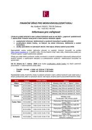 Před 1 měsícemFinanční úřad pro Moravskoslezský kraj - informace pro veřejnostFINANČNÍ ÚŘAD PRO MORAVSKOSLEZSKÝ KRAJ Na Jízdárně 3162//3, 709 00 Ostrava Tel.: +420 953 146 005 Informace pro veřejnost Lhůta pro podání přiznání k dani z příjmů fyzických osob za rok 2025 v „papírové“ podobě končí 1. dubna 2026. Finanční úřad proto s cílem pomoci občanům zajistil: · poskytování informací, telefonických a osobních konzultací k podání přiznání, · prodloužené úřední hodiny, ve kterých lze získat informace, telefonické a osobní konzultace, · služby specialistů ve vybraných obcích, kde nejsou zřízena územní pracoviště. Nejsnadnější cestou podání daňového přiznání je vyplnění chytrých formulářů na portále https://www.mojedane.cz s využitím volby „On-line finanční úřad“ nebo volby „Elektronická podání pro Finanční správu“ a jejich elektronické odeslání. Přesto jsou stále četně využívané i služby související s osobním podáváním dokumentů adresovaných finanční správě, s vyplňováním tiskopisů a s poskytováním osobních i telefonických konzultací ke správě daní. Od 23. března do 1. dubna 2026 proto budou prodlouženy úřední hodiny na všech územních pracovištích i v sídle finančního úřadu takto: - Pondělí – čtvrtek: v době od 8:00 do 17:00 hodin. - Pátek: v době od 8:00 do 14:00 hodin.