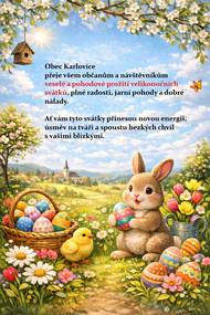 Před 3 dnyStavění májky u hasičské zbrojniceVážení spoluobčané, jako každý rok, také letos připravuje Sbor dobrovolných hasičů Karlovice stavění májky, které patří mezi krásné a oblíbené tradice i naší obce. O dnešní přípravu a přepravu stromu k hasičské zbrojnici se postarali pracovníci obce, jak zachycuje přiložená fotografie. Stavění májky proběhne v pátek 1. května 2026 od 17:00 hod. u hasičské zbrojnice. Zveme všechny, kteří se chtějí zapojit do výzdoby i následného postavení májky. Přípravy budou probíhat přibližně od 15:00 hod. Na konci měsíce května pak na tuto tradici naváže také tradiční kácení májky, pořádané taktéž sborem dobrovolných hasičů, spojené s posezením u ohně. Těšíme se na společné setkání a věříme, že si tuto pěknou tradici společně užijeme.