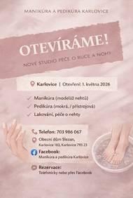 Před 5 dnyManikúra a pedikúra Karlovice✨ OTEVÍRÁME! Nové studio péče o ruce a nohy 📍 Místo: Karlovice (Obecní dům Slezan, Karlovice 183, 793 23) 📅 Otevření: 1. května 2026 Nabízené služby: Manikúra (modeláž nehtů) Pedikúra (mokrá i přístrojová) Lakování a péče o nehty 📞 Telefon: 703 986 067 📱 Facebook: Manikúra a pedikúra Karlovice 🗓 Rezervace: telefonicky nebo přes Facebook