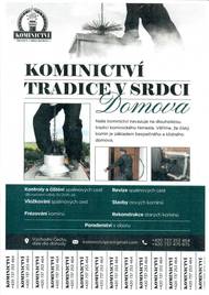 Sdružení kominíků a topenářů bude provádět v PONDĚLÍ 3.listopadu požadované kontroly a čištění komínů. Čištění komínů 550 Kč, čištění plynových kotlů 550 Kč, revize kotlů na tuhá paliva 1 300 Kč. Dále nabízí levné vložkování a frézování komínů. Zájemci se mohou objednat na tel. 608 748 989.