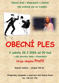 Obecní úřad Kladruby pořádá v sobotu 28.2.2026 od 20 hod v sále obecního domu tradiční Obecní ples . Hrát bude tentokrát kapela Profil se zpěvačkou Kateřinou Ševidovou . Vstupné 200 Kč . Rezervace nutná u starosty Romana Kunsta tel.730 127 779.