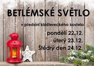 Zveme vás k vyzvednutí Betlémského světla, symbolu pokoje, naděje a Vánoc. Betlémské světlo bude k dispozici v předsíni kláštereckého kostela: pondělí 22. 12. úterý 23. 12. Štědrý den 24. 12. Přijďte si odnést kousek vánočního světla a pohody do svých domovů.