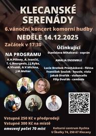 Zveme Vás na koncert Klecanských serenád, který se koná v neděli 14. prosince 2025 od 17:30 hodin v kulturním centru Rychta Klecany. Vánoční koncert proběhne v obsazení: Lucie Brotbek Prochásková – flétna, Stanislava Mihalcová – soprán, Jakub Dvořák – violoncello, Filip Dvořák – cembalo a František Souček – housle, viola. Na programu zazní skladby autorů K. H. Pillneyho, A. Ivančiće, T.-L. Bourgeoise, J. J. Ryby, A. Vivaldiho, A. V. Michny a J. M. Moltera. Předprodej: Klecanské serenády - Vstupenky na koncerty, ne 14. 12. 17:30 ve městě Klecany - GoOut