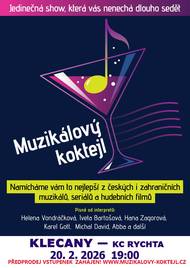 Nejlepší z českých i zahraničních muzikáků, seriálů a hudebních filmů se uskuteční v show Muzikálový koktejl, který se uskuteční v KC Rychta v Klecanech 20. 2. 2026 od 19 hodin. Předprodej vstupenek probíhá na www.muzikalovy-koktejl.cz