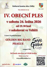 Obec Zdiby zve v sobotu 24. ledna 2026 od 19,30 na IV. obecní ples, který se uskuteční v sokolovně ve Veltěži. K tanci i poslechu hraje Golden big band Prague. Vstupné 300 Kč.