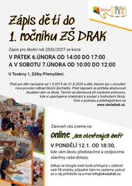 V pátek 6. 2. od 14 do 17 hodin a v sobotu 7. 2. od 10 do 12 hodin proběhne Zápis dětí do 1. ročníku ZŠ Drak pro školní rok 2026/2027 (U Továrny 1, Zdiby-Přemýšlení). V pondělí 12. 1. proběhene online "Den otevřených dveří" na FB stránkách školy. Více informací na https://skoladrak.cz/