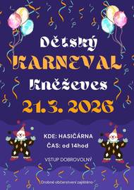 Zveme Vás na dětský karneval, který proběhne v sobotu 21.3.2026 od 14 hodin na hasičce v Kněževsi. Vstup dobrovolný, drobné občerstvení zajištěno.