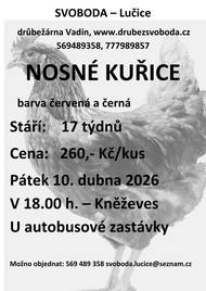 Svoboda Lučice bude v úterý 10.3.2026 v 18:00 hod u zastávky v Kněževsi prodávat nosné kuřice, stáří 19 týdnů, barva červená a černá, cena 280 Kč/ks. Možno objednat na tel. 569489358.