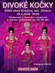 Ostravská travesti skupina Divoké kočky přijede 25.4.2026 v 19:00 hod. poprvé do Kněžic. Celovečerní zábavný program je plný nezapomenutelných humorných scének, písniček známých zpěvaček, krásných kostýmů, situačního humoru, smíchu a je vhodný jak pro ženské tak mužské publikum. Přijďte si užít večer plný zábavy do kněžického kina. Občerstvení zajištěno. Předprodej a rezervace vstupenek u paní Zdeňky Gottliebové na tel. 723 381 685. Vstupné 200,- Kč.