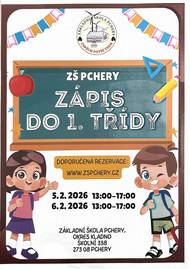 Zápis do 1. třídy ZŠ Pchery se uskuteční 5. a 6. února 2026, vždy od 13:00 do 17:00. Doporučujeme rezervaci termínu zápisu na webových stránkách školy www.zspchery.cz