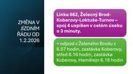Vzhledem k novému jízdnímu řádu, který začne platit od 1. února 2026, dojde k úpravě jízdních časů na lince 862. Spoj 4 bude uspíšen v celém úseku o 3 minuty. Nově bude odjezd z Železného Brodu v 6:07 hodin a v zastávce Koberovy, střed v 6:16 hodin.