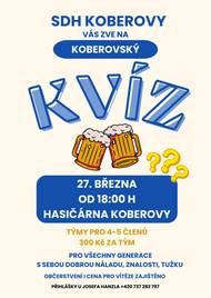Zveme vás na Koberovský kvíz, který se uskuteční 27. března 2026 v hasičárně Koberovy. Akce začíná v 18:00 a je určena pro týmy o 4–5 členech. Nezapomeňte se přihlásit u Josefa Hanzla na telefonním čísle 420 737 282 797.