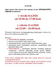 Vážení občania, oznamujeme Vám, že zberné miesto za Spoločenským domom v Kočovciach bude z technických príčin v sobotu 04.04.2026 zatvorené. Otvorené bude v sobotu 11.04.2026.