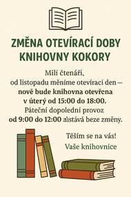 Kokory: Mili ctenari, od 4.11.2025 bude knihovna otevrena nove kazde utery 15-18 hod. Patecni dopoledne 9-12 h zustava beze zmeny.