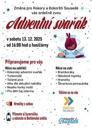 Kokory: Dnes od 16 hod adventni svarak u hasicarny se Zmenou pro Kokory a Kokorskymi Sousedy. Muzete se tesit na bramboraky, oblozene topinky, chleb se skvarkovou pomazankou, hranolky aj. Zdarma jmeli a betlemske svetlo.