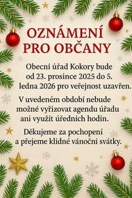 Kokory: Oznamujeme obcanum, ze obecni urad i knihovna budou od 23. 12. 2025 do 5. 1. 2026 uzavreny. V tomto obdobi nelze vyrizovat agendu ani vyuzit sluzeb knihovny. Dekujeme za pochopeni.