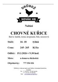V průběhu roku 2026 se uskuteční prodeje chovné drůbeže z veterinárně kontrolovaných chovů. Nabídka zahrnuje různé druhy kuřic, pekingské kačeny, husy a další. Objednávky lze provést telefonicky nebo e-mailem.