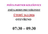 Dne 24. března 2026 bude pošta v Kolešovicích otevřena pro veřejnost od 07:30 do 09:30. Děkujeme za pochopení.