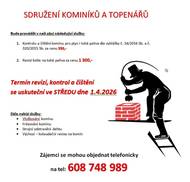 Služby sdružení kominíků a topenářů budou v naší obci dostupné ve středu 1. dubna 2026. Nabízíme kontrolu a čištění komínů pro plyn i tuhá paliva, a to dle platných vyhlášek, za cenu 550 Kč. Dále provádíme revizi kotlů na tuhá paliva za cenu 1 300 Kč. Zájemci mohou také využít další služby, jako je